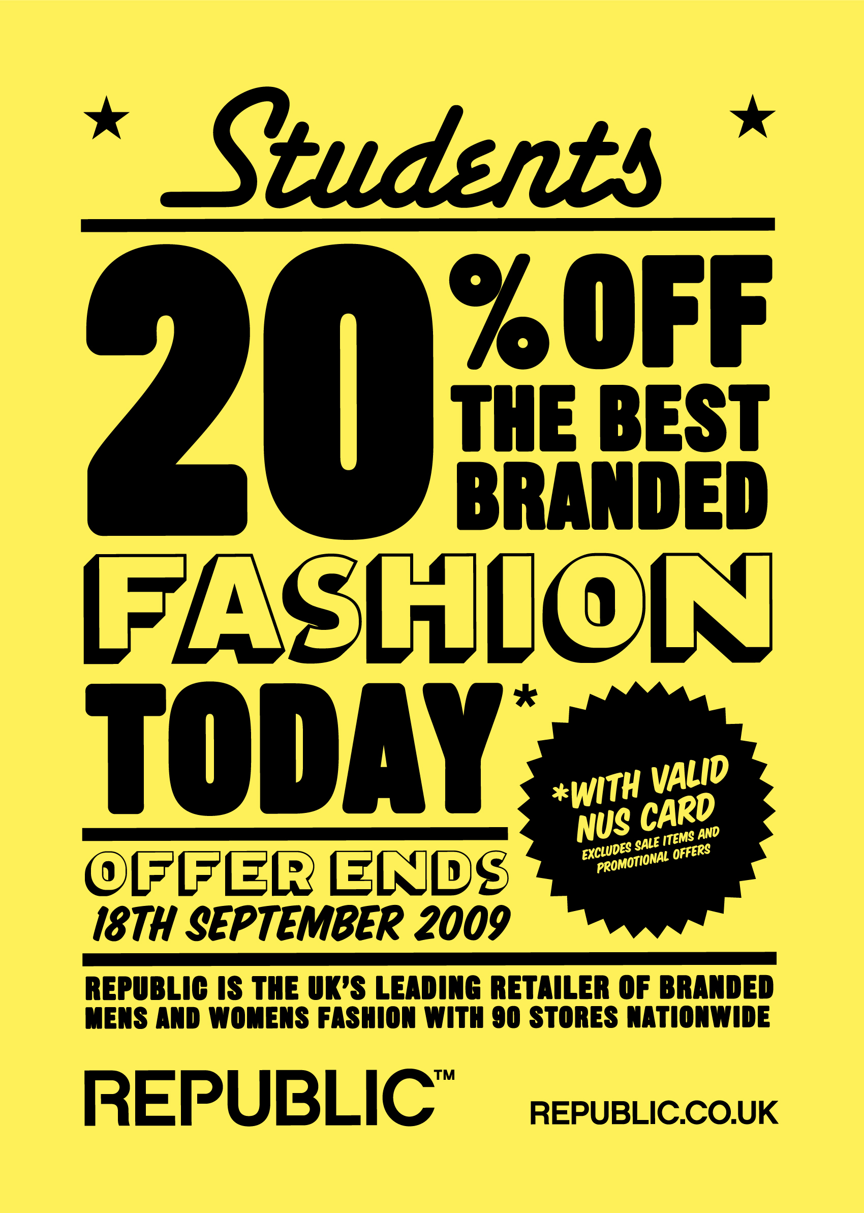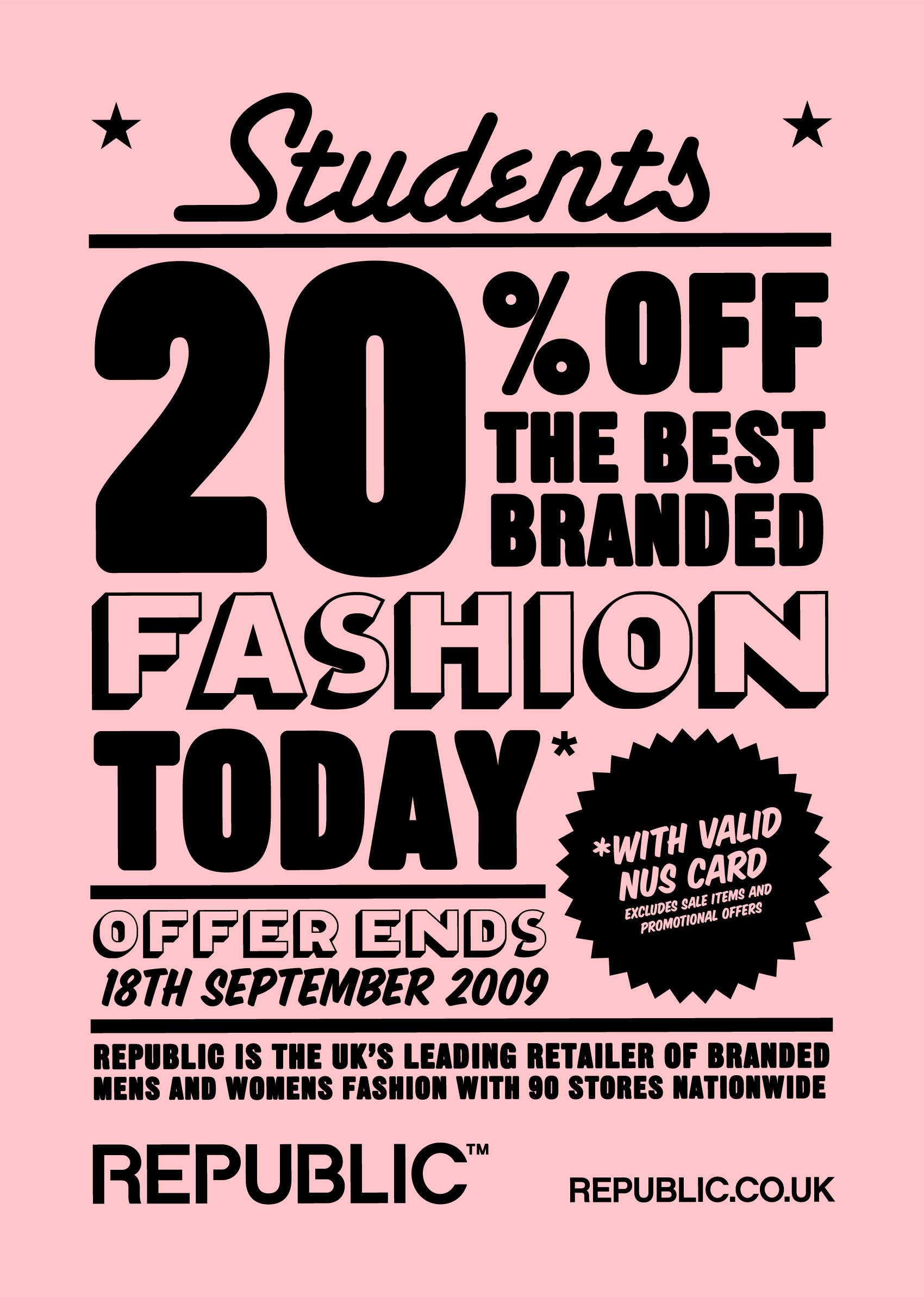 Students were one of fashion retailer Republic’s prime target audiences and we produced several campaigns targeting them with various special offers, promotions and student discounts.